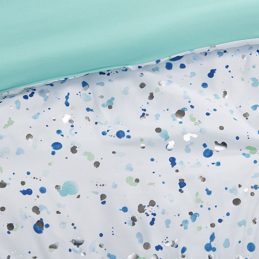 The Intelligent Design Abby Metallic Printed and Pintucked Comforter Set brings a fierce touch of glam to your bedroom. A vibrant metallic print in a blue aqua hue and chic pintucking adorns the face of the comforter for a stunning look. The matching shams (1 in Twin/TwinXL) coordinate perfectly with the comforter, while oblong and square decorative pillows provide the finishing touches. Machine washable for easy care, this contemporary comforter set adds a glamorous update to your bedroom décor. This bedding set has an antimicrobial treatment that provides built-in freshness protection, reducing the growth of odor causing bacteria to keep fabric lasting longer. Items in the set may come in a rolled or compressed packaging, which will need to be fluffed up or steam ironed before use to remove wrinkles.